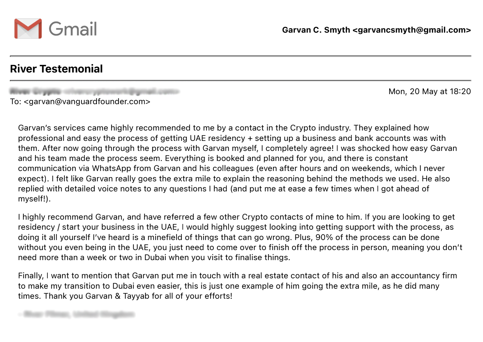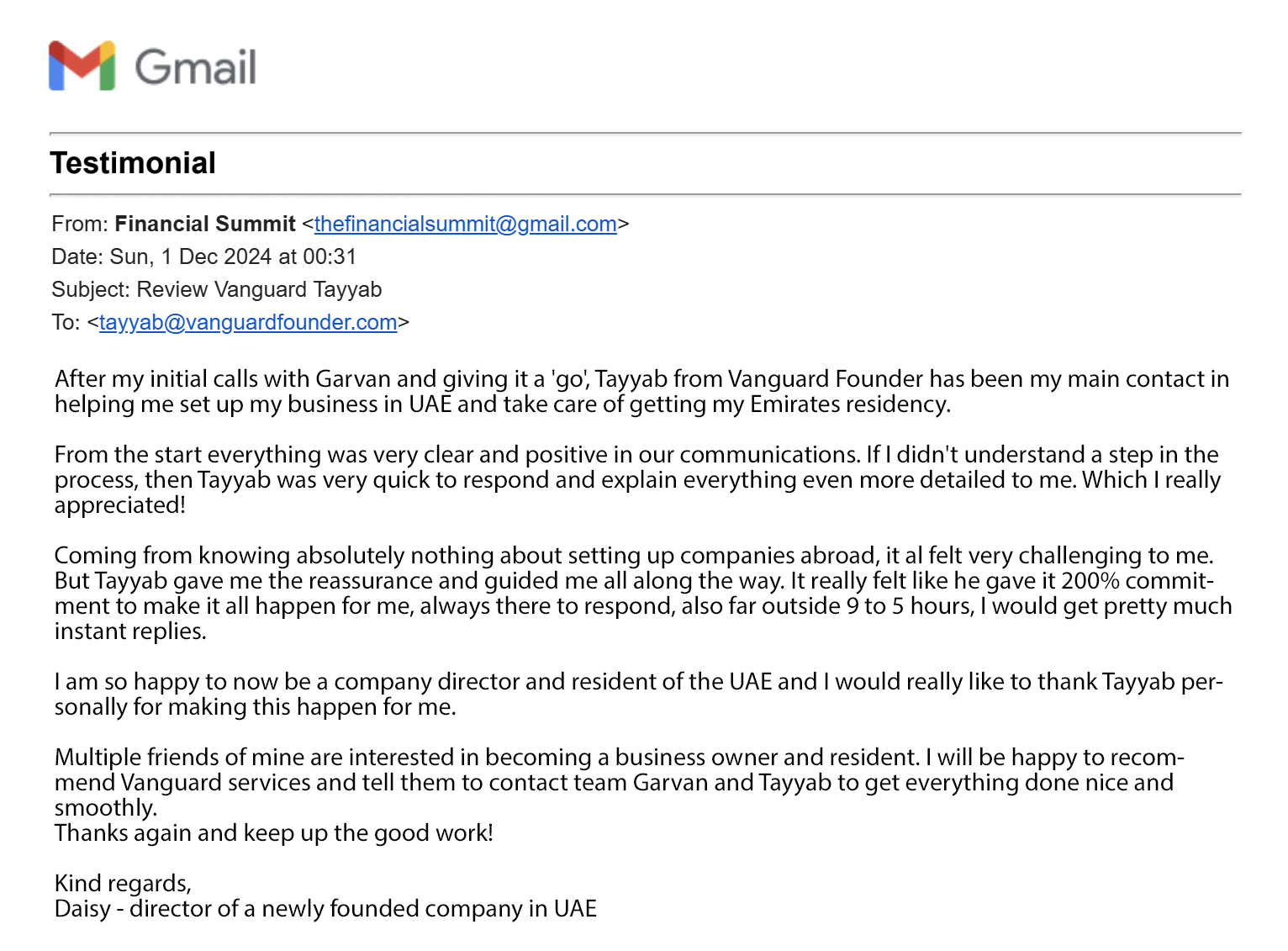 EXCELLENT Based on 40 reviews Posted on George BarnettTrustindex verifies that the original source of the review is Google. Suzette was amazing throughout the whole process! Everything was easy, efficient and she always replied quickly if I had any questions. Thanks again!Posted on Louis ArmstrongTrustindex verifies that the original source of the review is Google. Garvan and Suzette have been extremely helpful in getting me set up in Dubai! Suzette replies to my messages instantly and is always on hand to help me with anything I need. Very happy with the service, not to mention they made it very fast and easy!Posted on Dejan HorvatTrustindex verifies that the original source of the review is Google. We had EXCEPTIONAL service from Suzette Watson. I'm beyond impressed with organization, communication and general guidaince. Getting UAE resident ID was super easy with Suzette. Really exceptional service and someone I would recommend to everyone.Posted on Jesse HillingTrustindex verifies that the original source of the review is Google. Very happy with the services they give me, thank you guys! Suzette give me super support, thanks a lot 🙏🏽Posted on Ali TempleTrustindex verifies that the original source of the review is Google. Suzette and the team were very organized and great at communication. They made the whole process feel seamless and secure. We highly recommend working with Garvin, Suzette and the rest of this excellent team.Posted on Reece MillerTrustindex verifies that the original source of the review is Google. A great service handled by true professionals. I highly recommend! Big love xPosted on Charlie DavisTrustindex verifies that the original source of the review is Google. Garvan, Tayyab and Suzette have been nothing short of excellent in helping and assisting me. Amazing on communication and even better at executing on what we had discussed. Could not recommend more highly!Posted on Sol HydeTrustindex verifies that the original source of the review is Google. Great team and excellent service helping me set my business up. Suzette Garvan and the rest of the time were absolutely amazing. Couldn’t recommend morePosted on Danielle O'NeillTrustindex verifies that the original source of the review is Google. Highly recommend the team at Vanguard. Exceptional service was provided and every detail of the business process that I needed was provided with ease and stress free thanks to Tayyab.